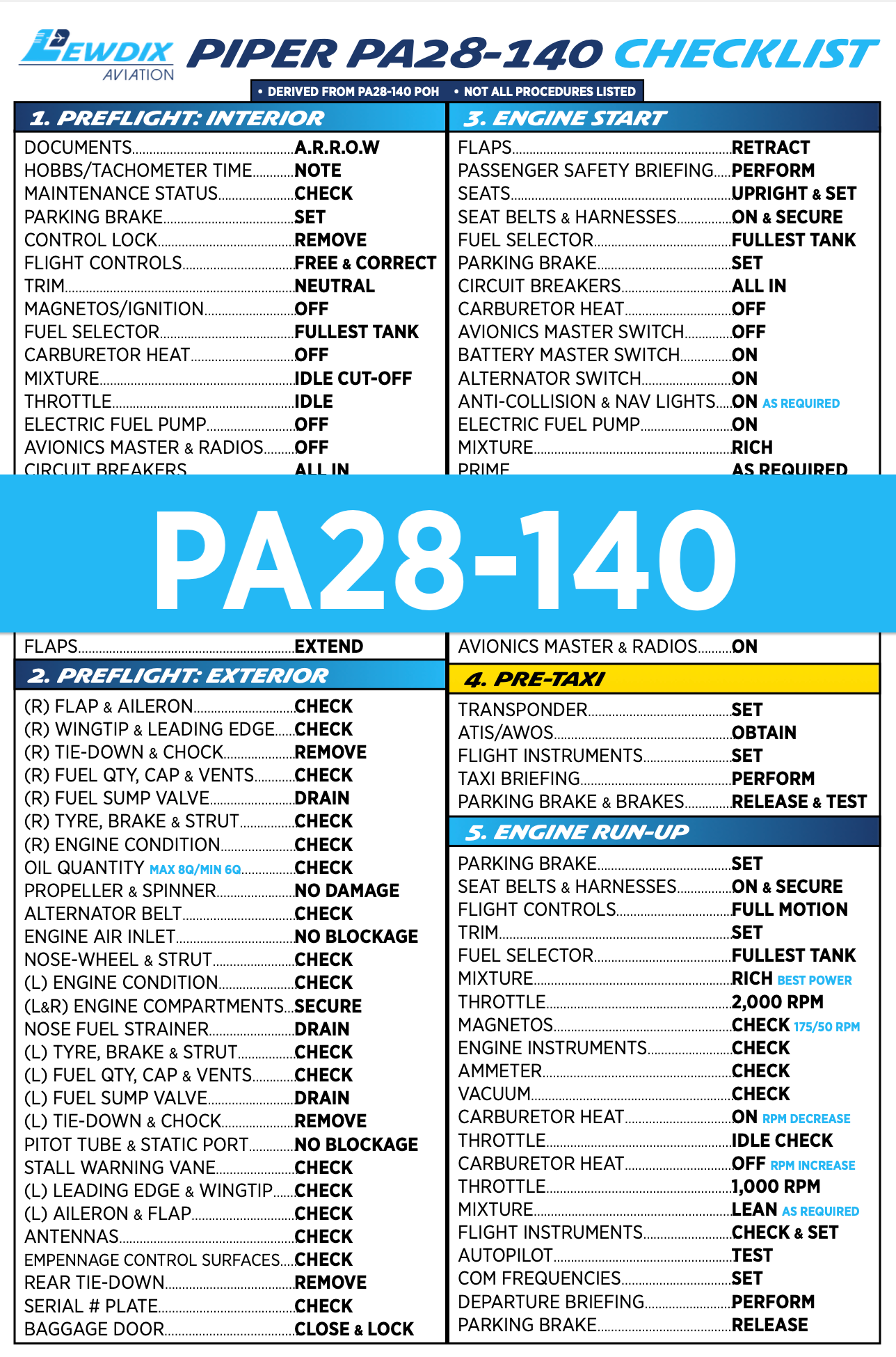 - Easy to follow procedures derived from the PA28-140 POH.